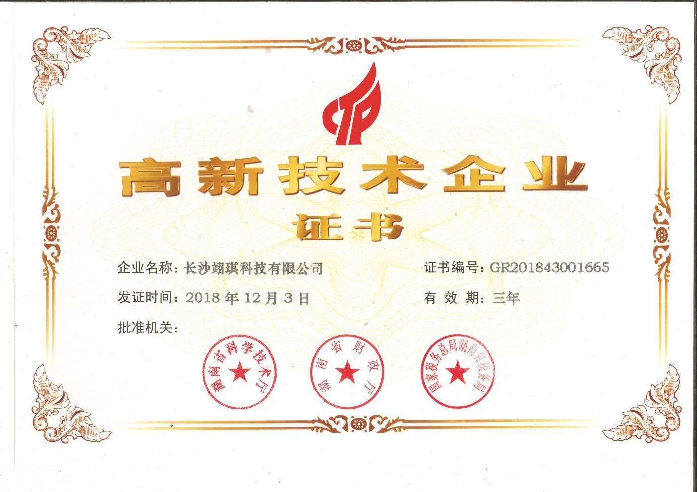 根據(jù)國家《高新技術(shù)企業(yè)認定管理辦法》和《高新技術(shù)企業(yè)認定管理工作指引》的相關(guān)規(guī)定,憑借公司雄厚的技術(shù)實力、科學(xué)的企業(yè)管理,長沙翊琪科技有限公司在2018年12月被認定為國家級高新技術(shù)企業(yè)。